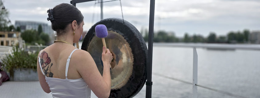 Join us every Wednesday from 6–7 PM for a unique Gong Bath experience on deck, gently floating on Rummelsburger See. Within this urban oasis, you’ll be guided into deep relaxation as the sun sets over the city.